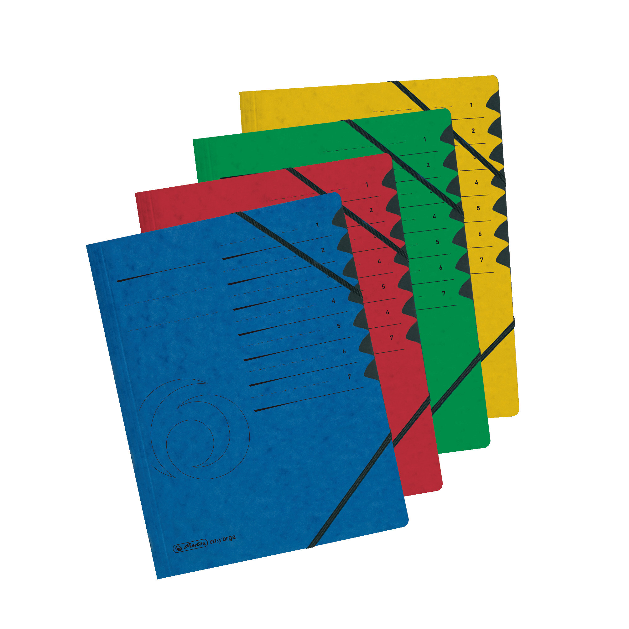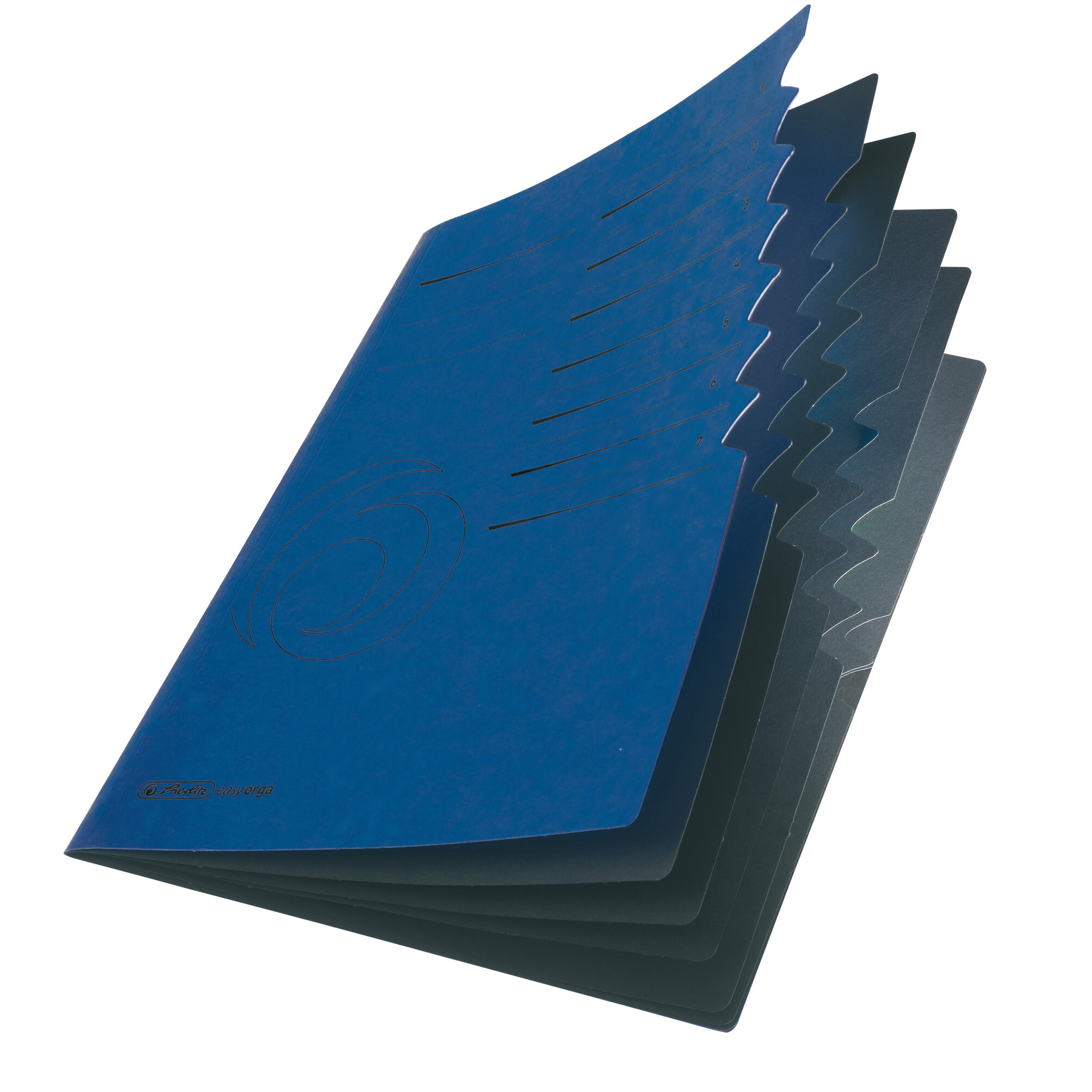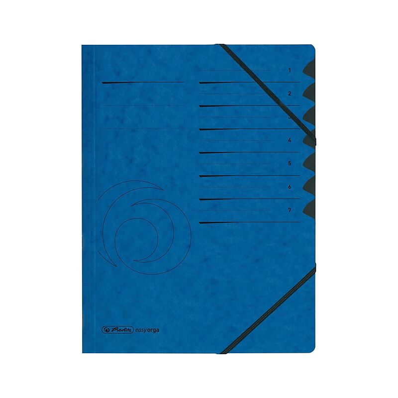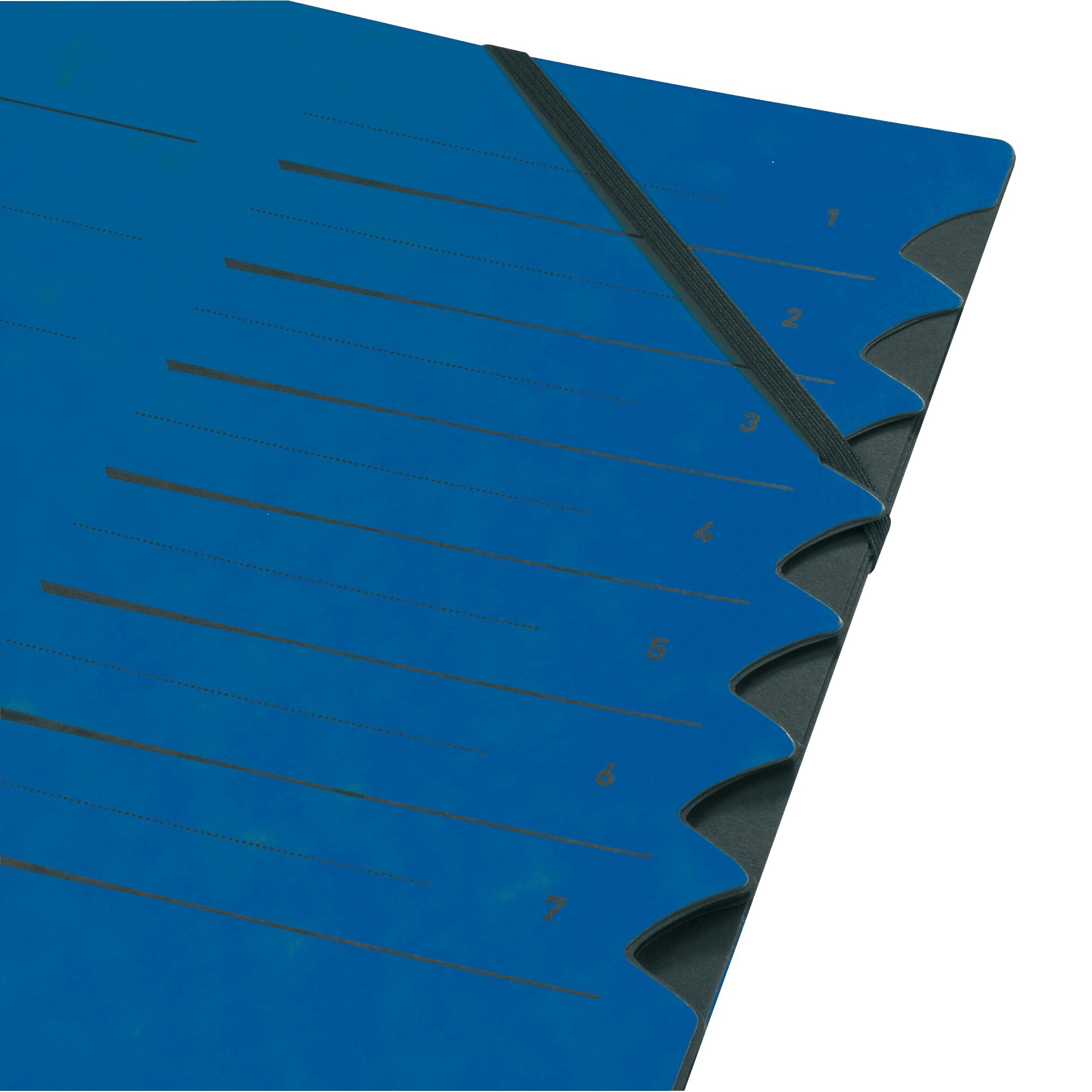 Außen starker Quality-Karton innen schwarzer Manila-Karton mit Sichtlöchern und Taben. Organisationsdruck 1-7, 7 Fächer, 2 Gummizüge. Farbe: blau. Inhalt: 1 Stück