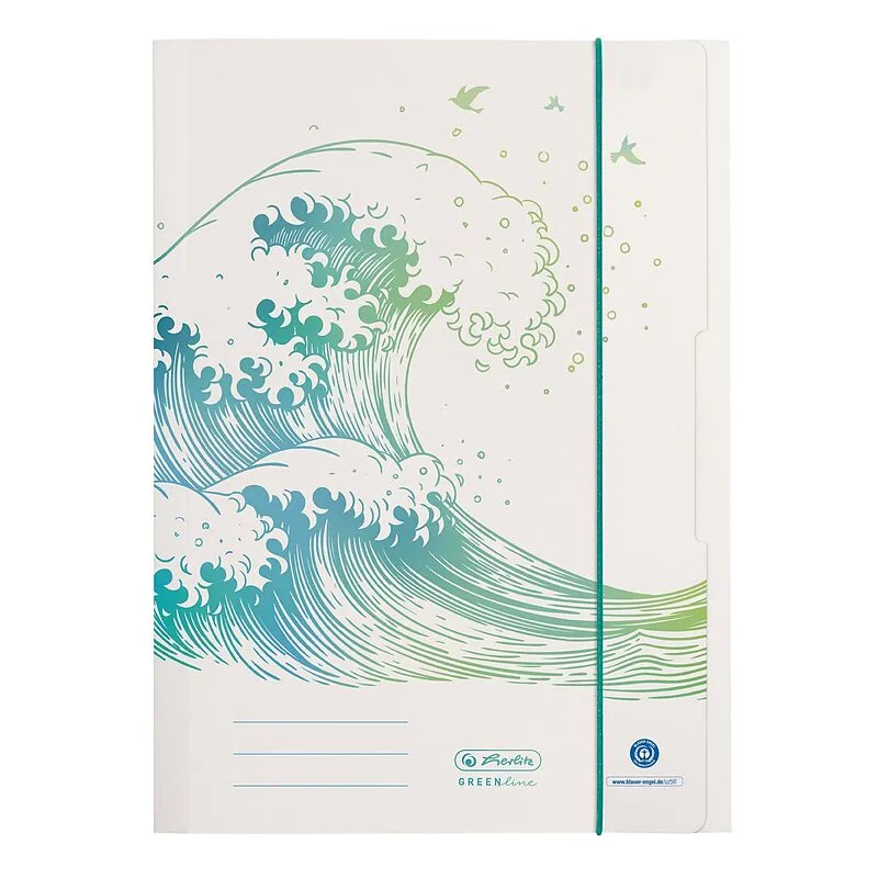 Recyclingkarton, mit 3 Innenklappen, mit Gummiband, Motiv GREENline Welle, 1 Stück.