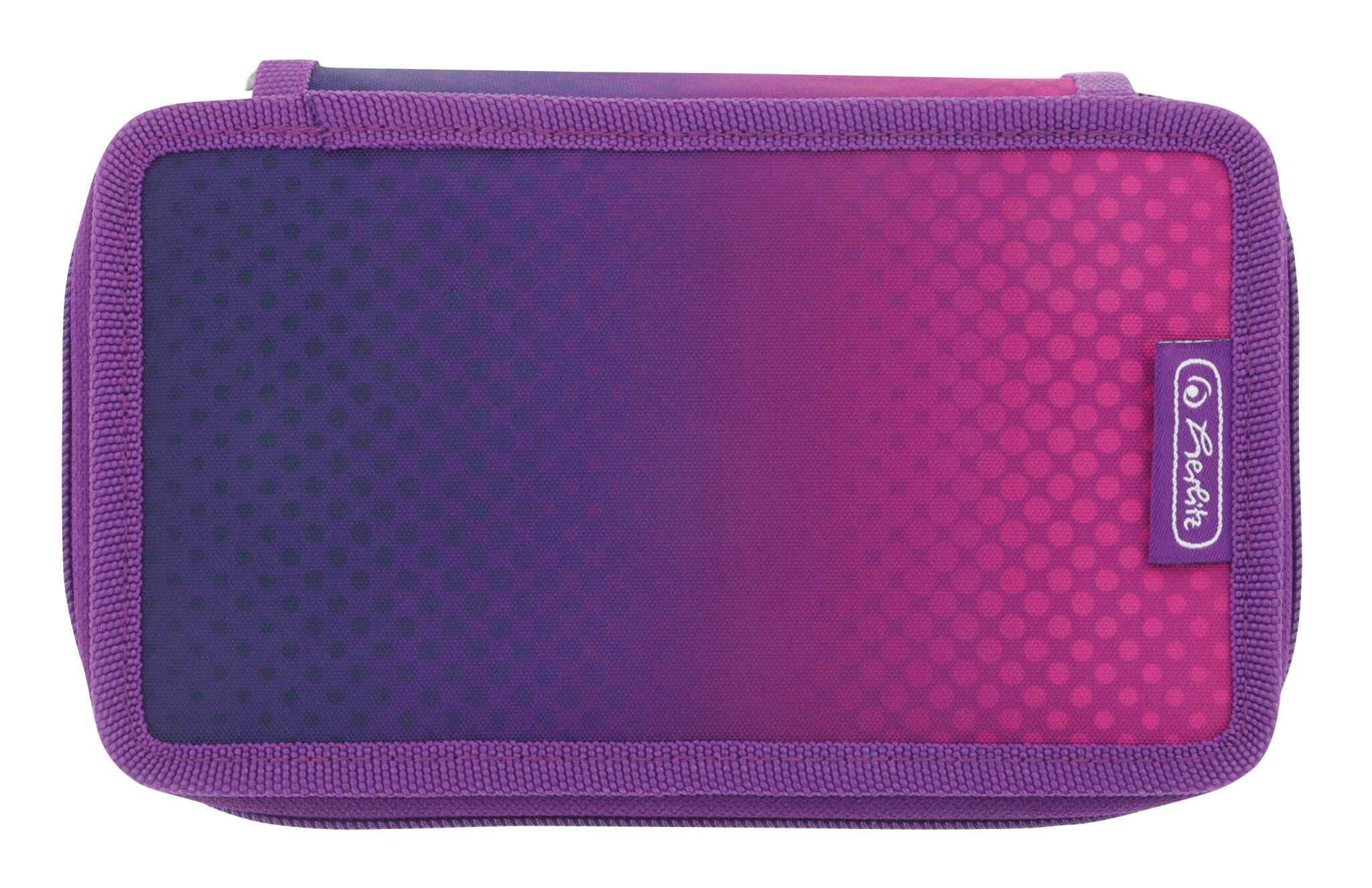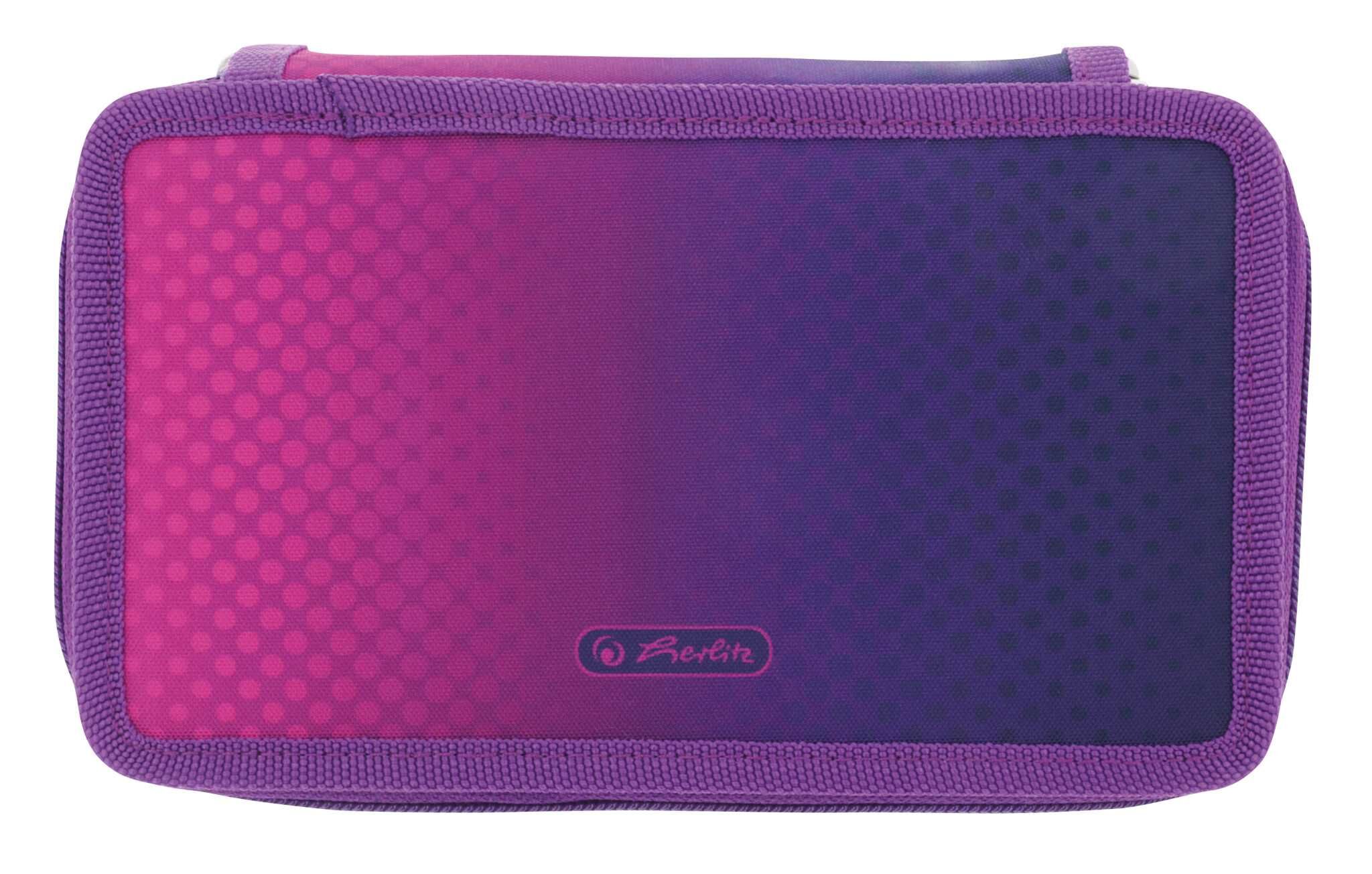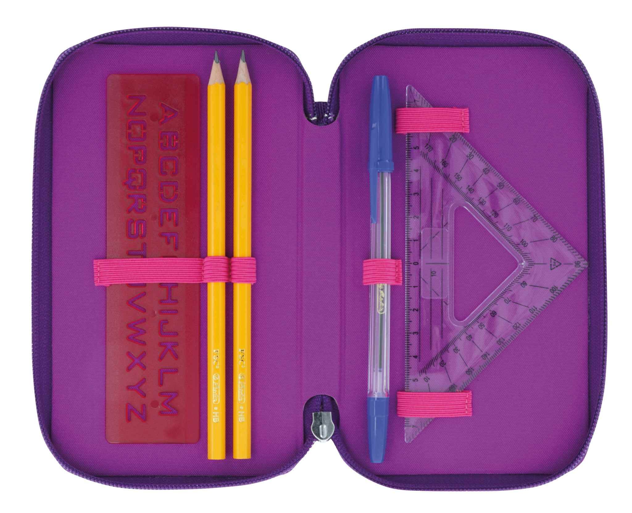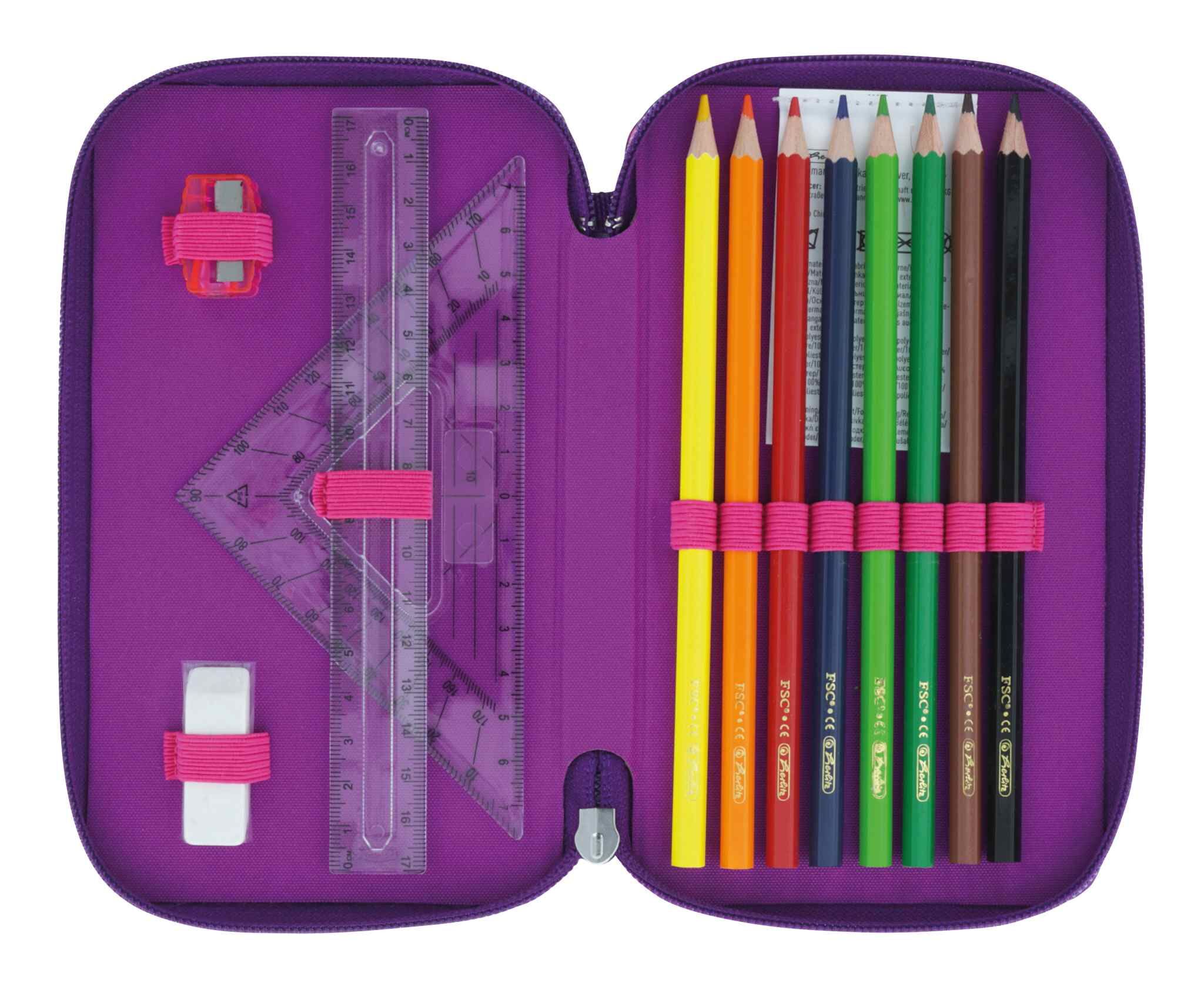 für Schule; Uni oder Beruf; 3 Klappen mit farbigem Reißverschluss; Schlaufen in unterschiedlichen Größen; guter Überblick; leichter Transport; farbiges Innenmaterial aus PVC; Maße: 19 x 11;5 x 7 cm; Befüllung: Bunstifte, Fasermaler, Bleistifte, Lineal, Dreieck...