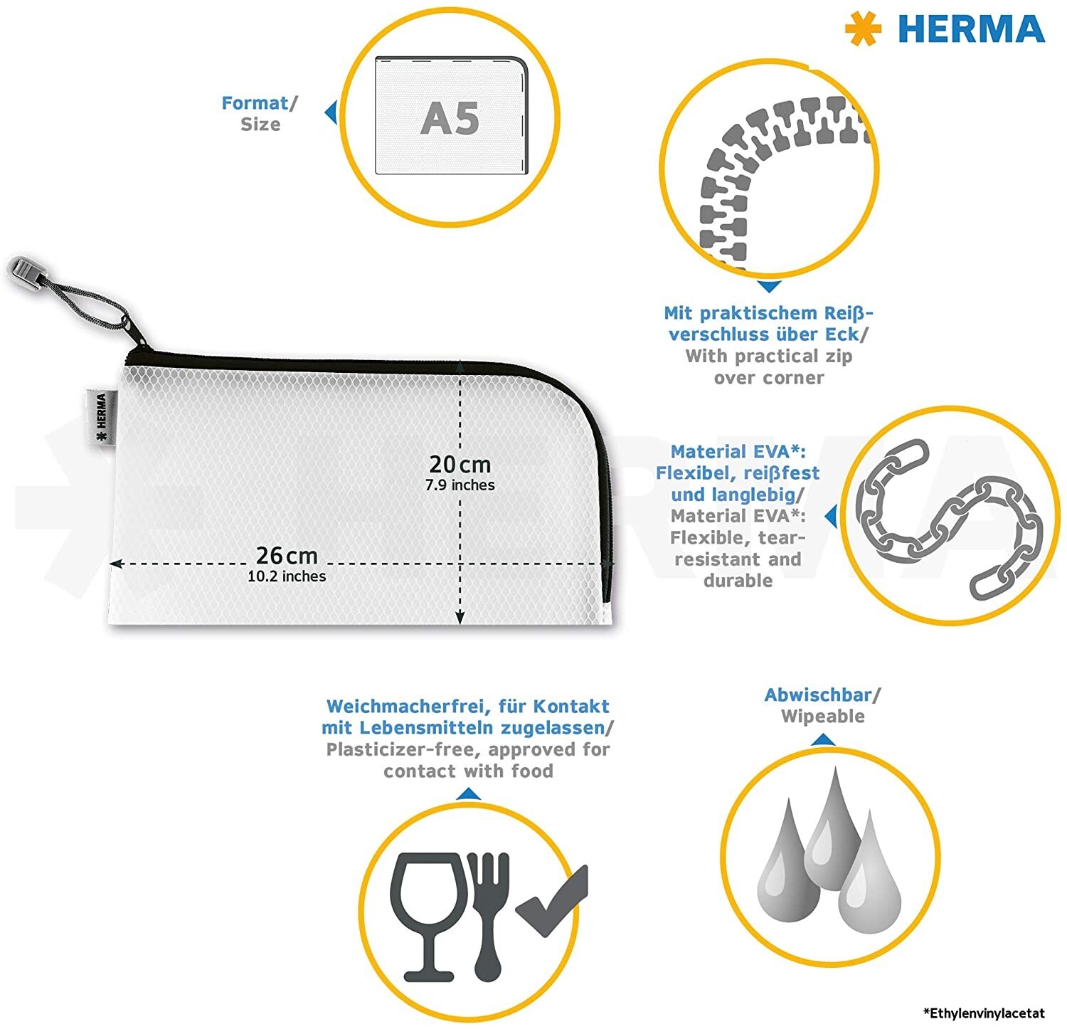 Die HERMA Universaltasche A5, 26 x 20 cm, rot eingefasst, mit praktischem Reißverschluss über Eck gibt es auch in den Farben blau, gelb, grün und orange. Die halbtransparente Tasche ist für viele Zwecke super praktisch: zum Sammeln, Sortieren, Archivieren. Auf...