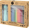 Air Brush Set Stift hineindrehen und los geht's! So kinderleicht ist die Bedienung dieses Air Brush. Die Farbe des Aquarellstiftes wird in der Luft zerstäubt wodurch sich im Nu effektvolle Bilder und Verläufe kreieren lassen die Schablonen helfen dabei. Spass...