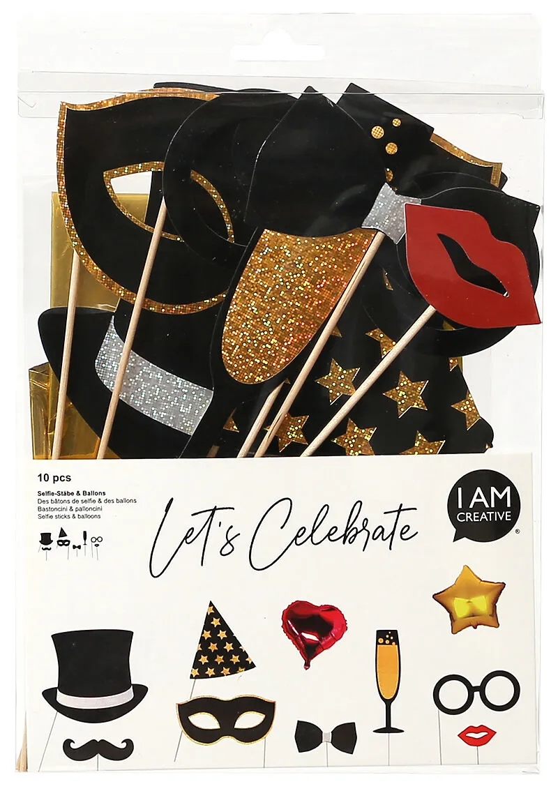 Photoprops Ob Geburtstag, Hochzeit oder Neujahr, mit den tollen Dekorationsartikeln zum passenden Thema kann man im Handumdrehen für die richtige Umgebung sorgen.Inhalt: 8x Selfiesticks (laserbedruckt), 1x Folienballon Herz (ø 45 cm), 1x Folienballon Stern (ø...