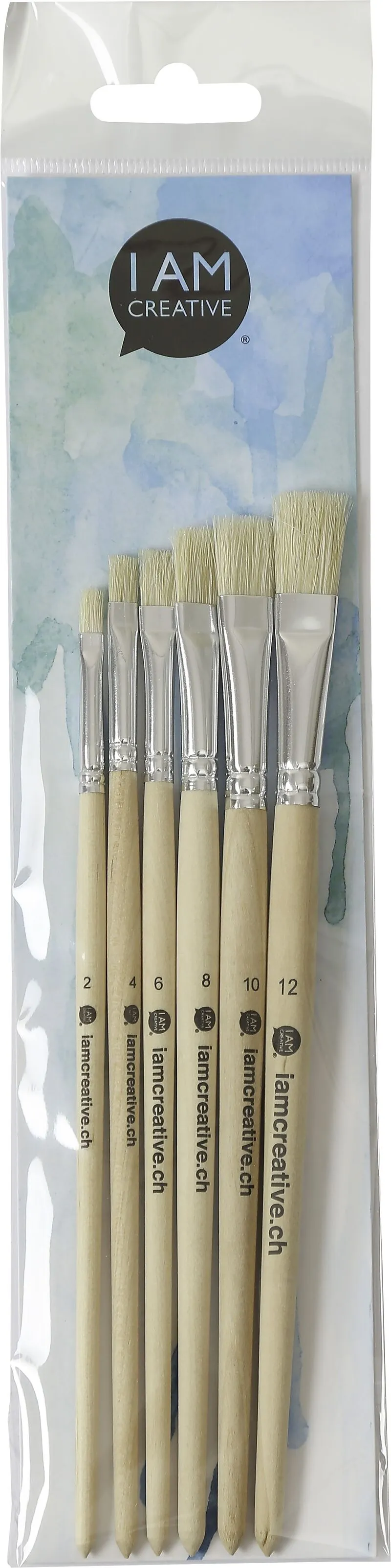Material: weisse Borste • Pinselform: flach • Blechzwinge • naturbelassener Stiel • für Deck-, Aquarell-, Acryl- und Ölfarben • Set mit den Grössen: 2/4/6/8/10/12 • FSC zertifiziert