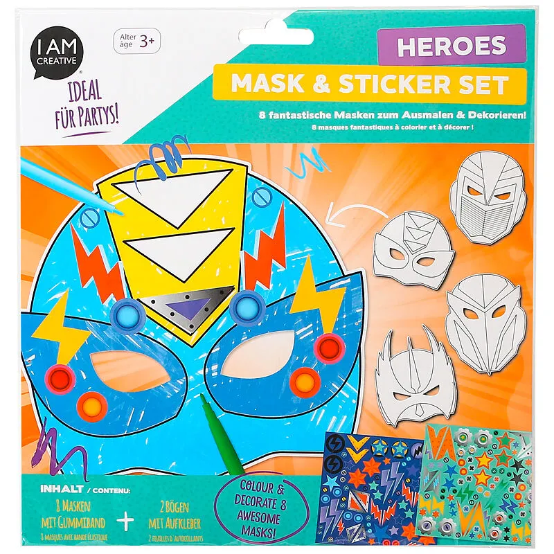 Masken zum Ausmalen und Dekorieren • Inhalt: 8 Masken mit Gummiband, 2 Bögen mit Aufklebern • für Alter 3+