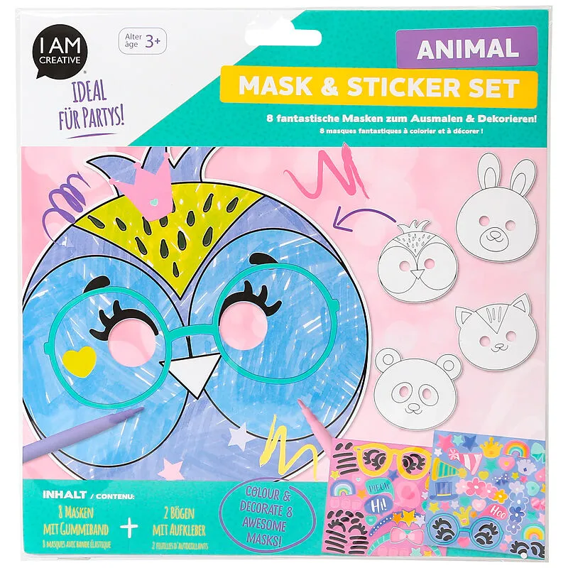 Masken zum Ausmalen und Dekorieren • Inhalt: 8 Masken mit Gummiband, 2 Bögen mit Aufklebern • für Alter 3+