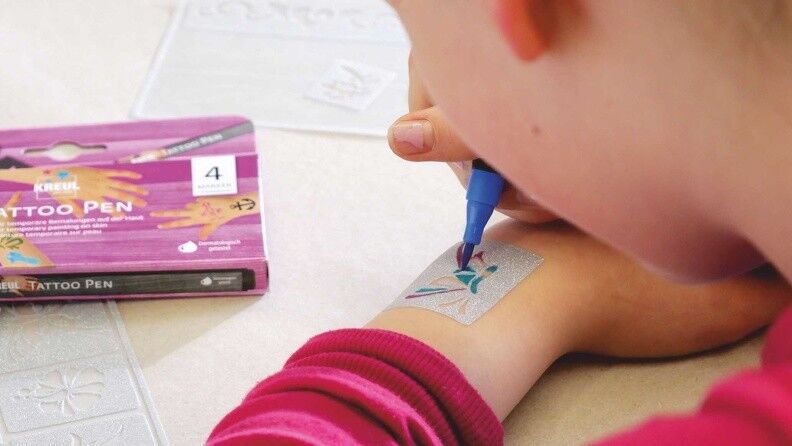 Tattoo Pen's Mit formstabiler Softpinselspitze angenehm in der Anwendung. Inhalt: 4 Stifte in Pink, Blau, Grün, Schwarz, 3 Motiv-Schablonen Zum kreativen Bemalen und Verzieren von fettfreier Haut Für Strand, Party, Fasching, Kindergeburtstag Für temporär...
