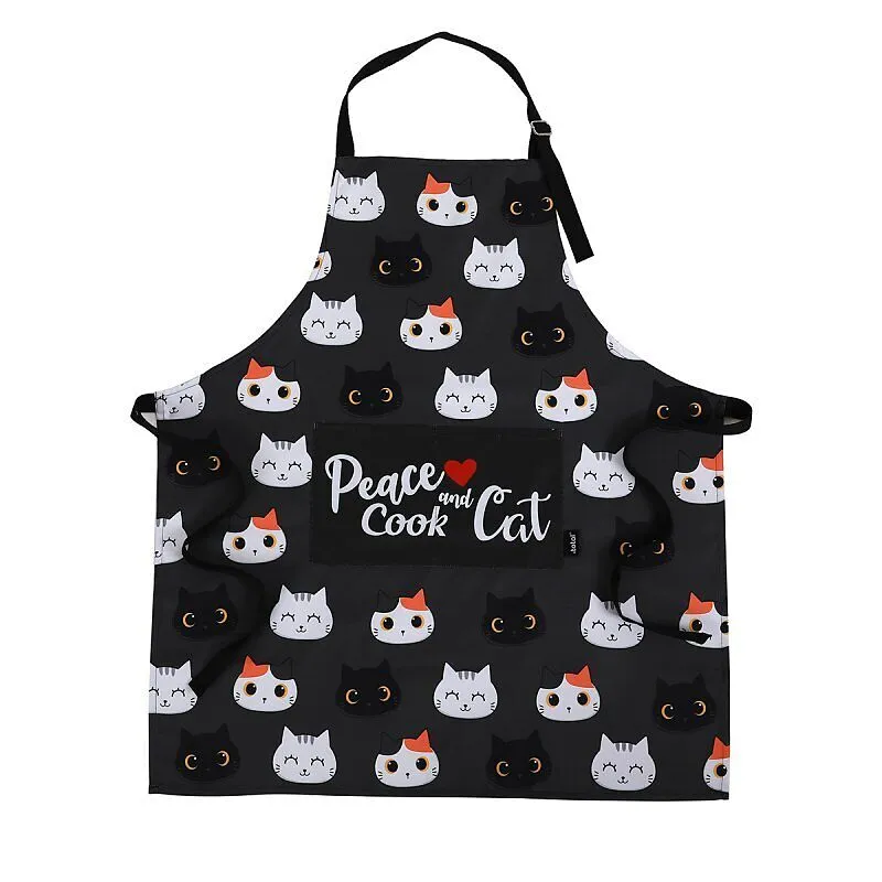 Diese schwarze Kochschürze mit einem charmanten Katzenmotiv und dem Spruch Peace, Cook and Cat bringt Stil in Ihre Küche! Mit einer Grösse von 68 x 78 cm schützt sie Sie beim Kochen und sorgt für gute Laune bei jedem Gericht.