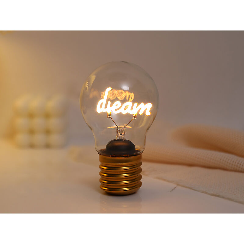 Tischlampe Entdecken Sie die dekorative Lampe in Glühbirnenform mit dem Schriftzug dream in der Mitte, die in warmem Gelb leuchtet. Diese energiesparende LED-Beleuchtung eignet sich ideal zur Dekoration von Schlafzimmern, Kinderzimmern oder Büros. Einfach auf...