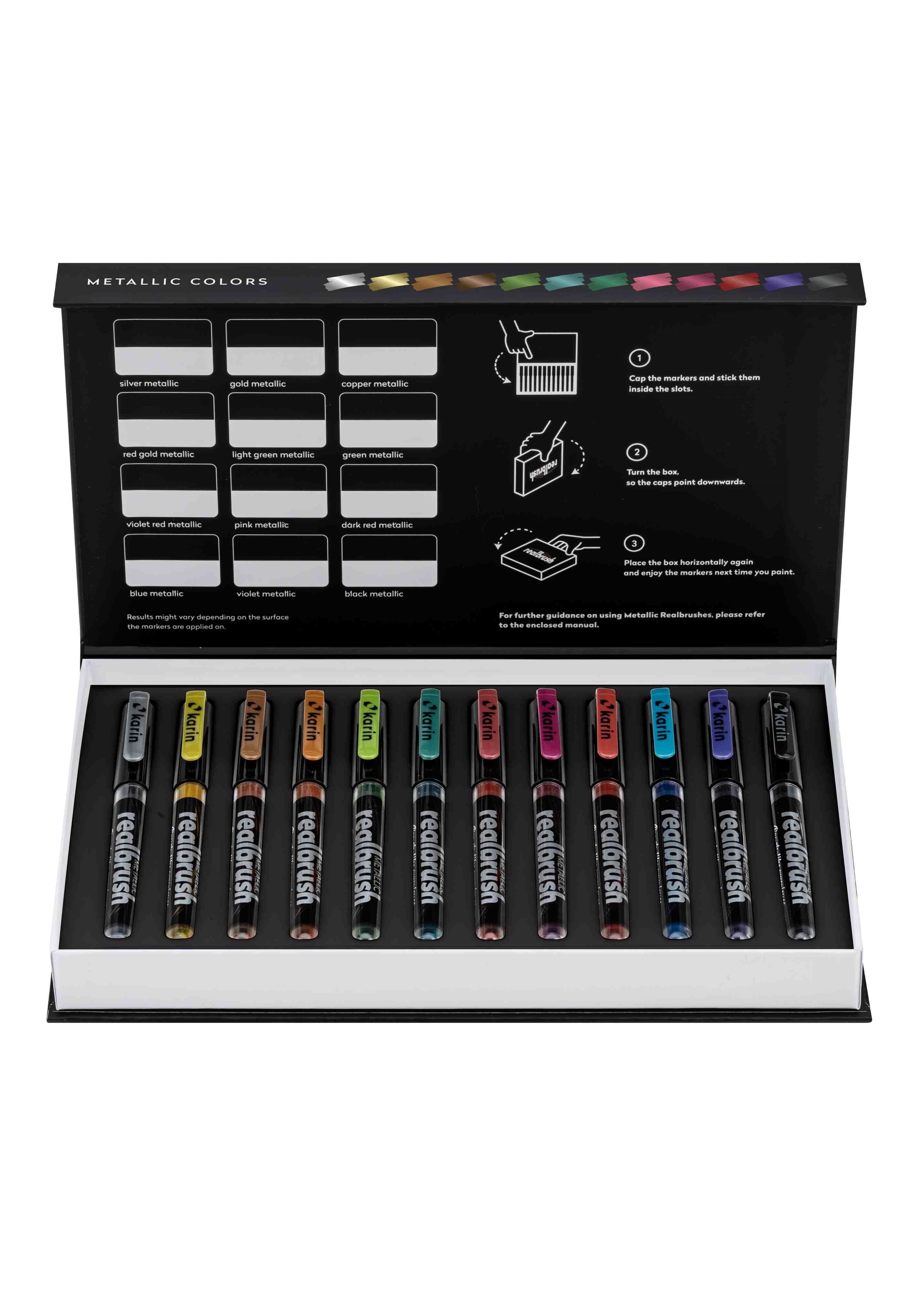 REAL PRO - Brush Pen REAL BRUSH METALLIC sind in einem Markergehäuse eingeschlossene moderne Pinsel (sog. real brush Marker). Sie enthalten 2,4 ml ungiftige Farbe auf Basis von Metallpigmenten. Sie decken sowohl schwarze als auch weisse Oberflächen perfekt ab...