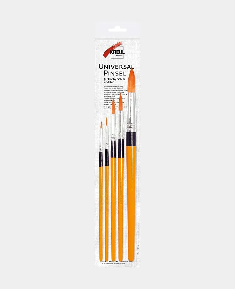 Dieses KREUL Pinsel-Set beinhaltet eine gute Auswahl an Universalpinsel für Kreative. - Universelle, flache und runde Synthetikpinsel in verschiedenen Größen: flach Gr. 6, 12, 16, rund Gr. 4, 8 - Nahtlose silberfarbene Zwinge, kurzer Stiel - Besatz aus goldfar...
