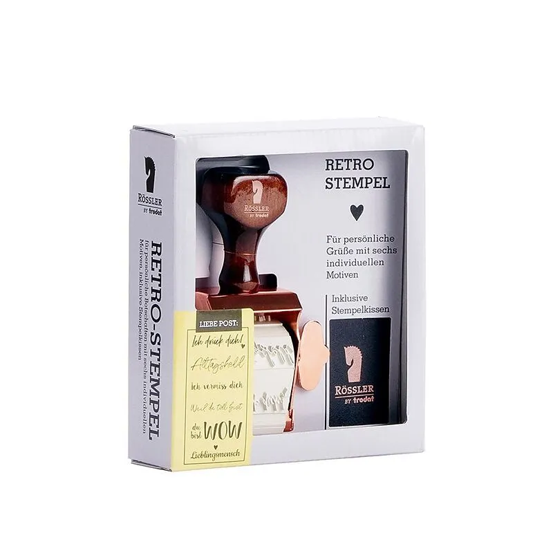 sechs individuellen Motiven, inklusive Stempelkissen. Rössler by Trodat.Durch Drehen der Flügelschraube wird ein Motiv ausgewählt.