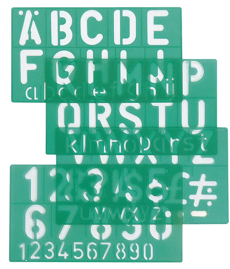 Die Schriftschablone von LINEX mit Tuschenoppen besitzt die wichtigsten Zeichen für fast jede Situation: Das Alphabet und die Zahlen sind schnell und präzise geschrieben mit Hilfe der LINEX Schriftschablone.