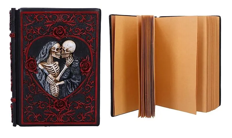 Ein wunderschön makabres Tagebuch mit zwei skelettartigen Liebenden in ewiger Umarmung, die die Liebe über das Leben hinaus symbolisieren. Mit einem detailreichen Harzeinband, verziert mit leuchtend roten Rosenmotiven und romantischen Gothic-Akzenten, und 92 h...