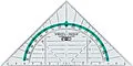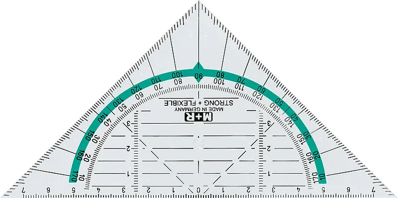 Geometriedreieck, gegenläufige Grad-Skala, türkis hinterlegt, transparent, im Etui.