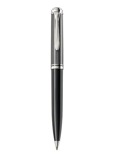 Edler Kugelschreiber. Streifenoptik in Schwarz-Anthrazit mit silbernen Zierelementen. Ausgestattet mit einer Drehmechanik. Mit Kugelschreibermine in schwarzer Schreibfarbe. Besonders weiches Schreibgefühl. Mit Pelikan-typischen Schnabelclip. Produktfarbe: Schw...