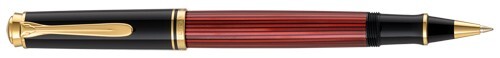Edler Tintenroller. Mit goldenen Zierelementen wie Ringe und Clip. Formschöner Pelikan Schnabelclip. Typische Pelikan-Streifenoptik in Schwarz-Rot. Farbe: Schwarz-Rot. Hochwertige Tintenrollermine 338 für ein weiches Schreibgefühl. Strichstärke: M. Schreibfarb...