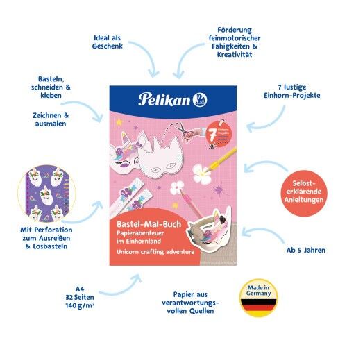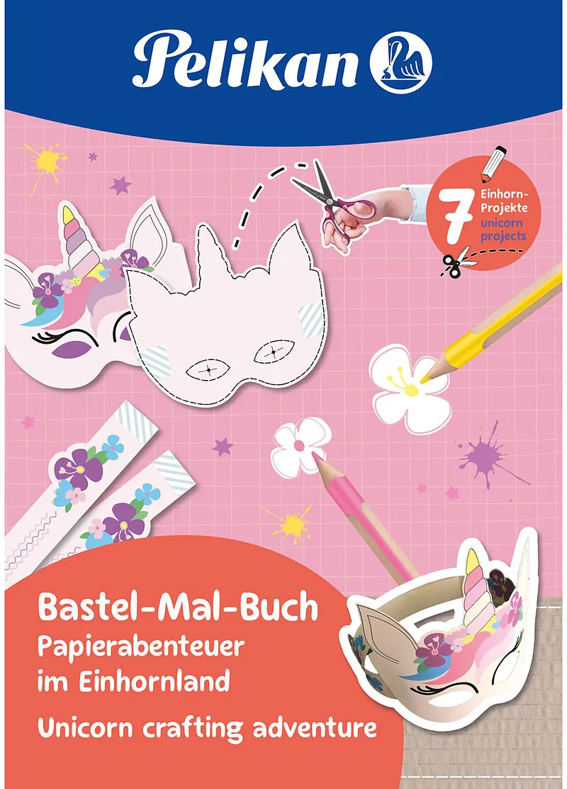 Verbastelbuch Das Pelikan Verbastelbuch "Einhornland" mit 7 Bastelprojekten ist ideal für 5-7 Jährige Kinder. Die perforierten Inhaltsseiten zum Abtrennen sind beidseitig farbig bedruckt und werden mit einer 2-Klammer-Rückstichheftung zusammen gehal...