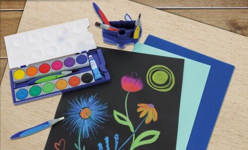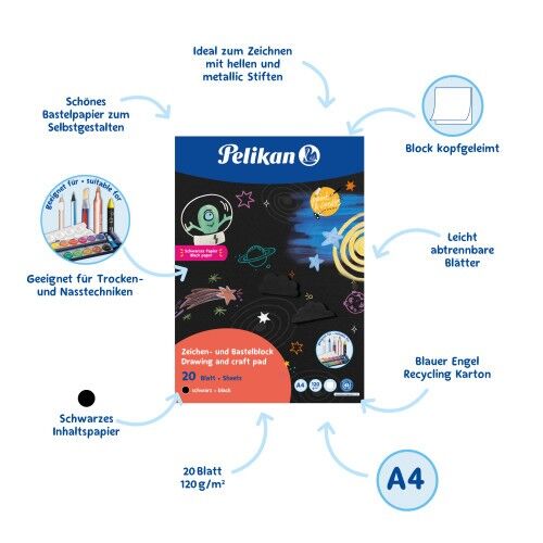 Hochwertiges schwarzes Papier zum Basteln, Zeichnen und Gestalten geeigent für Aquarellbuntstifte, weisse Stifte, Metallic Fasermaler und Deckfarben. Der Block hat eine stabile Rückenpappe 400g/m2 und der Block ist kopfgeleimt.
