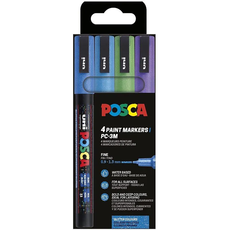 POSCA PC-3ML - Marker Dieses uni POSCA Marker Set enthält 4 Marker auf Wasserbasis für alle Oberflächen. Die Marker sind wasserfest auf porösen Materialien und abwischbar auf glatten Oberflächen. Die Farben sind intensiv und leuchtend. Ideal für unbegrenzte k...