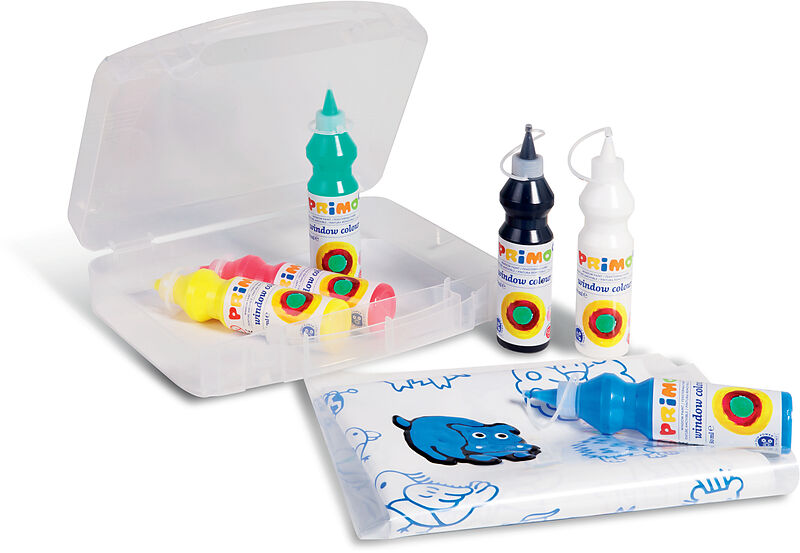 Fenstermalfarbe in Flaschen mit Mikrodosierverschluss, 6 Farben. Mehrzweckkoffer mit 1 Transparentfolie, 1 Anleitung, 1 Kunststoffunterlage 60x80cm.