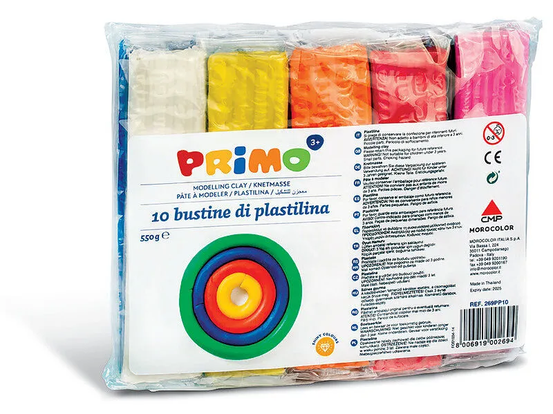 PRIMO - Knetmasse Praktische Plastilinknete auf Wachsbasis. Sie trocknet nicht aus und ist sehr dauerhaft. Mit den Händen geknetet wird sie weich und geschmeidig, perfekt, um Formen zu gestalten. Die Farben lassen sich untereinander vermischen, um neue Töne z...