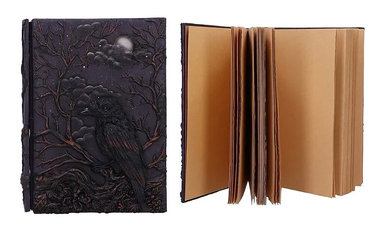 Ein mystisches Raven's Grimoire-Tagebuch mit einem eindrucksvollen Harzraben unter einem Mond, umgeben von Zweigmotiven auf der Vorderseite. Mit 92 leeren Seiten aus hochwertigem Papier und detailreichen Texturen. Ein gotisch inspiriertes Design und eine symbo...