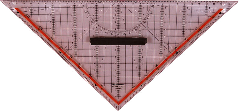 Technische Zeichendreiecke Technisches Zeichendreieck aus transparentem Acrylglas, mit abnehmbarem, von beiden Seiten einsetzbarem Griff, mit Tuschenoppen, mit farbig hinterlegter, gegenläufiger Gradskala. Länge Hypotenuse: 325 mm, Einstechpunkt für Zirkel be...