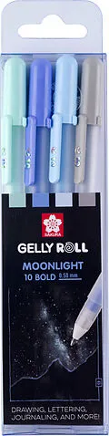 Ein Set mit 4 Gelly Roll Moonlight-Gelstiften in den Farben Pastellgrün, Pastellblau, Himmelblau und Warmgrau Hell.
