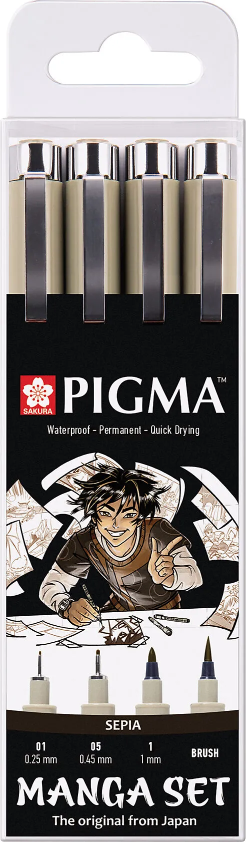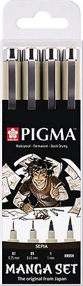 PIGMA MANGA - Fineliner Set 4 Stk. Manga Tool-Set mit 2 Pigma Micron-Stiften (01 und 05) in Sepia, 1 Pigma Graphic-Stift in Sepia ( 1.0) und 1 Pigma Brush in Sepia. Werden Sie mit diesem speziellen Manga-Set, mit ausgewählten Stiften der Pigma-Reihe in Sepia,...