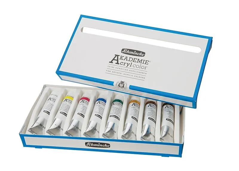 Karton-Malset, Grundsortiment mit 8 Tuben 20 ml feiner Künstler-Acrylfarbe (L x B x H 23,3 x 12 x 2,2 cm). Ein idealer Einstiegskasten in die Acrylmalerei mit ausgewählten brillanten, deckenden und lasierenden Farbtönen, perfekt zum Mischen vieler weiterer Far...