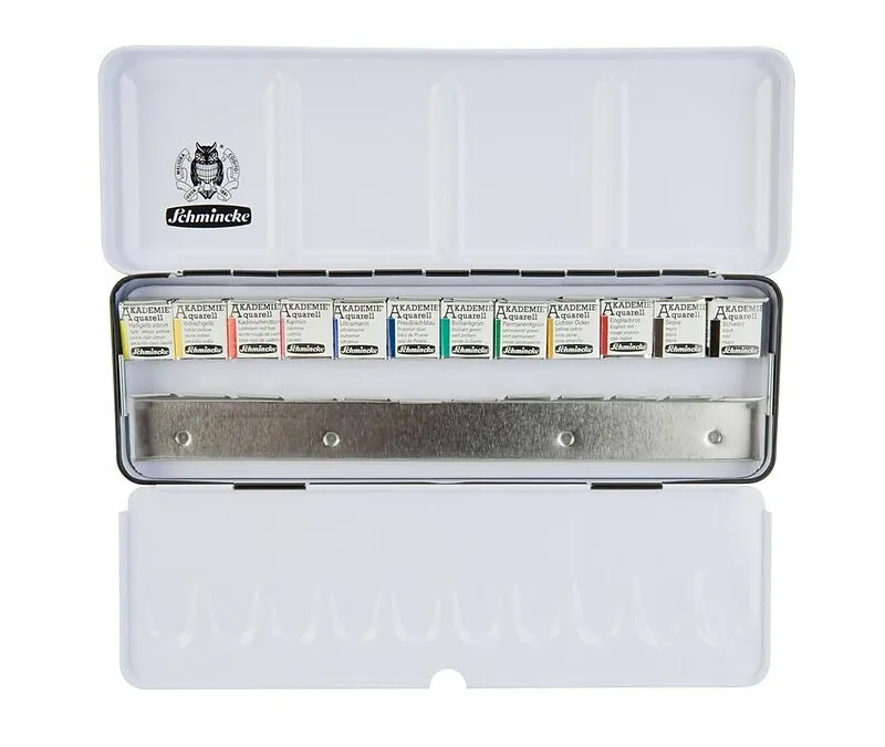 Stabiler Metallkasten, Grundsortiment mit 12 halben Näpfchen feiner Künstler-Aquarellfarbe und einer Leerschiene zur individuellen Bestückung mit weiteren 12 halben oder 6 ganzen Näpfchen (L x B x H 22,5 x 7,2 x 2,3 cm). Dies ist ein idealer Einstiegskasten in...