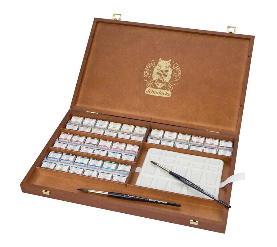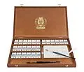 Der HORADAM Aquarell- Holzkasten ist nussbaum-gebeizt (L x B x H: 45,6 x 28 x 4 cm) und mit 47 feinsten Farbtönen in ganzen Näpfchen, dem Netzmittel Onetz, einer großen Porzellanpalette zum Mischen sowie 2 daVinci Pinseln (Größe 8 und 12) gefüllt. Die umfangre...