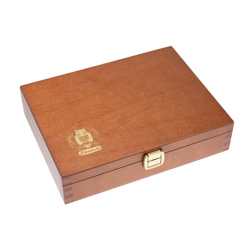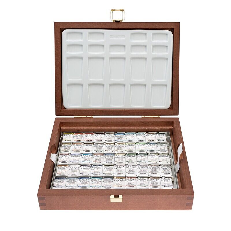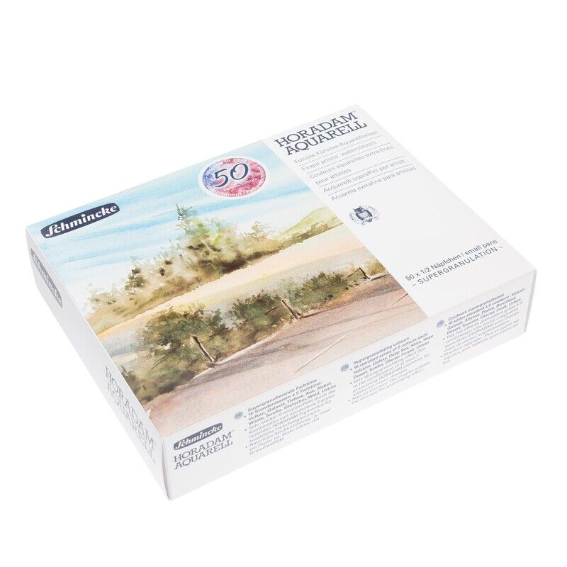 Der HORADAM nussbaumgebeizte Holzkasten mit 50 supergranulierenden Farben in halben Näpfchen, perfekte Ergänzung zum Standardsortiment, Farben mit sehr starkem Granuliereffekt durch die Kombination von je mindestens 2 granulierenden HORADAM Pigmenten für beson...