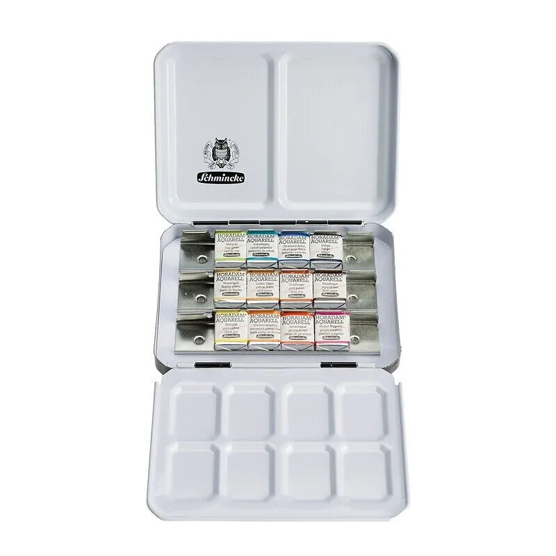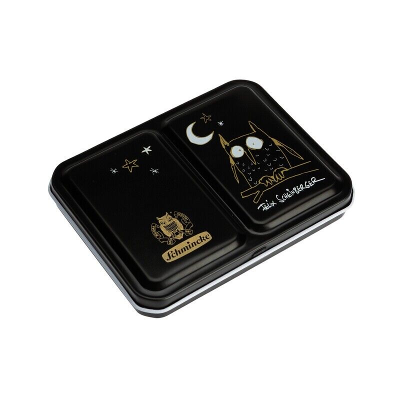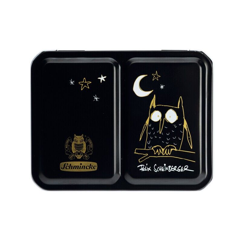 Metallkasten mit Farb- und Designkomposition Editon Felix Scheinberger: - Schwarzer Metall-Kompaktkasten mit einzigartiger Eulen-Illustration - 12 x Näpfchen mit besonderer Farbzusammenstellung des weltweit bekannten Künstlers, Illustrators und Professors ...