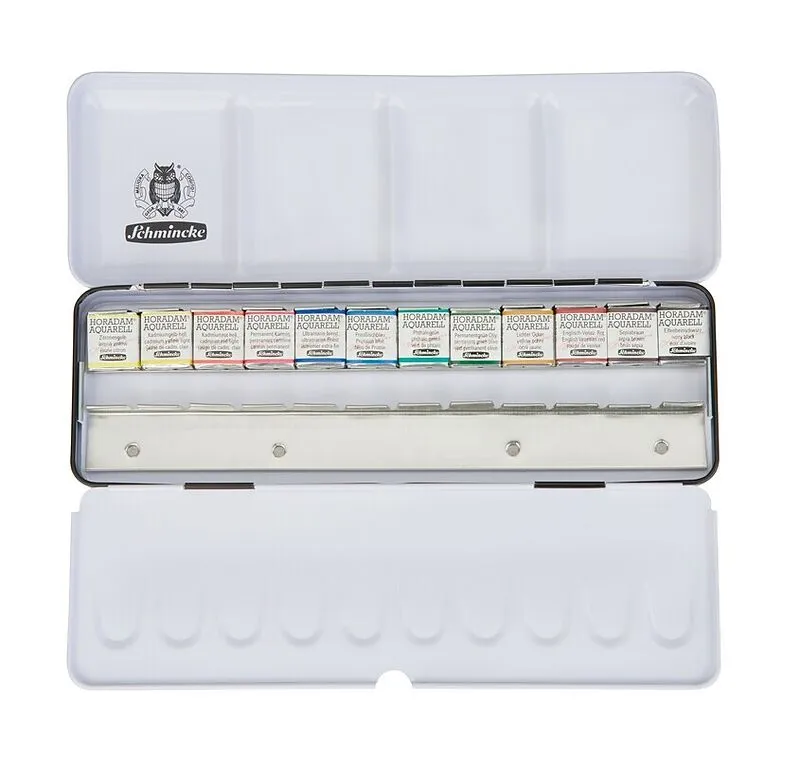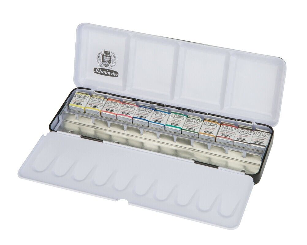Der HORADAM Einstiegskasten von Schmincke, besteht aus einem stabilen Metallkasten (L x B x H: 22,3 x 7,2 x 2,3 cm) mit 12 coloristisch ausgewählten Farben und Platz für 12 weitere Farben, sowie einer integrierten Mischpalette. Die Farben im Kasten befinden si...