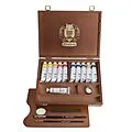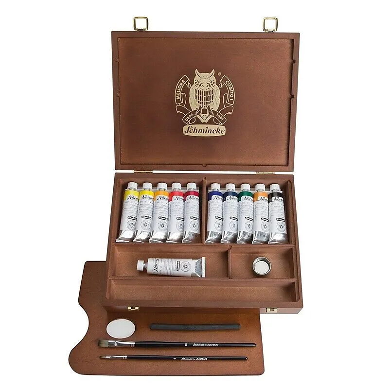 Norma Professional , Hochwertiger Holzkasten mit umfassendem Zubehör (L x B x H 24,3 x 41 x 5,9 cm), mit 11 höchstlichtechten, lasierenden und deckenden Ölfarbtönen 35 ml, Holzpalette, 1 Palettstecker, 1 Zeichenkohle, 2 daVinci Pinsel (Größe 4 und 10). Ideales...