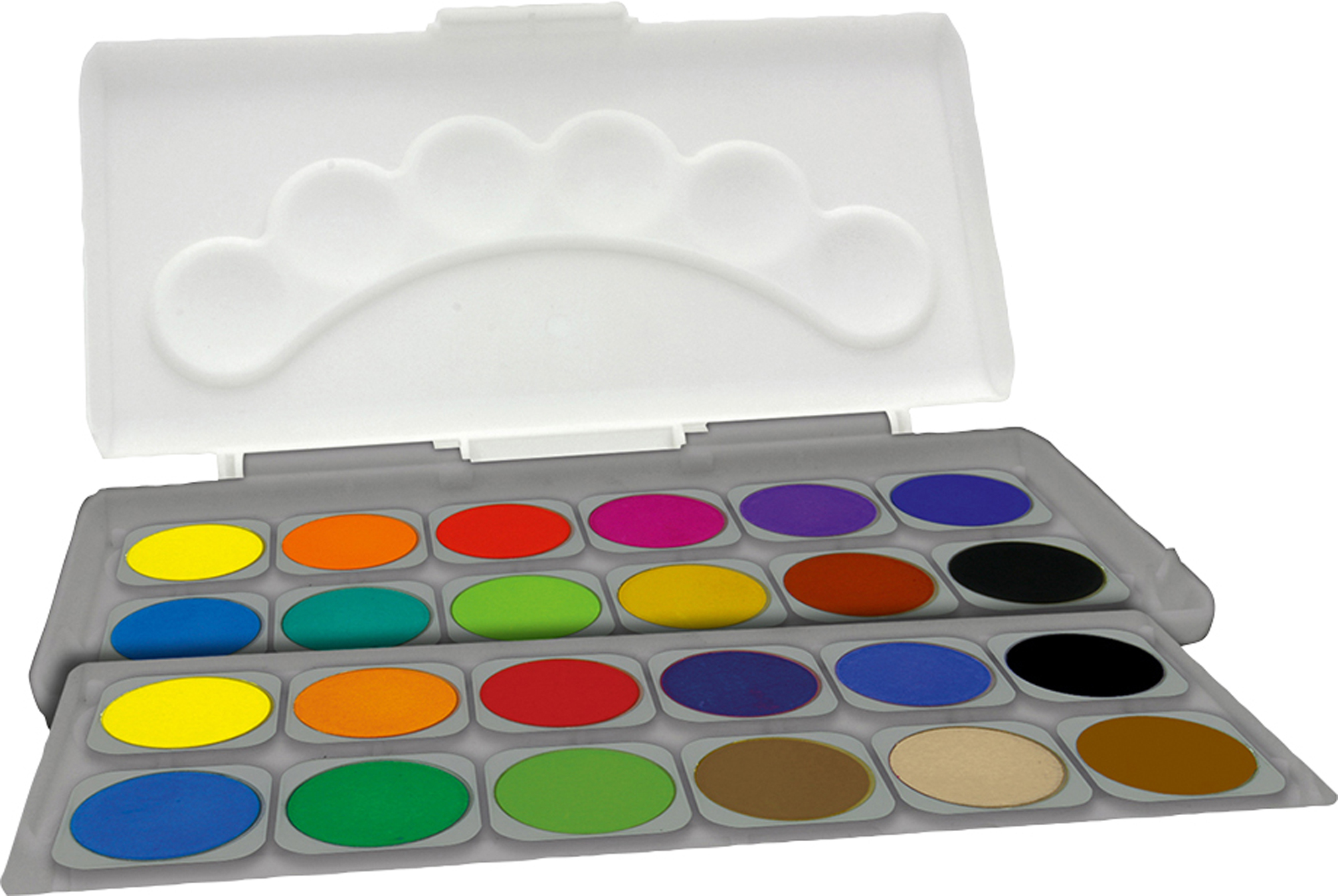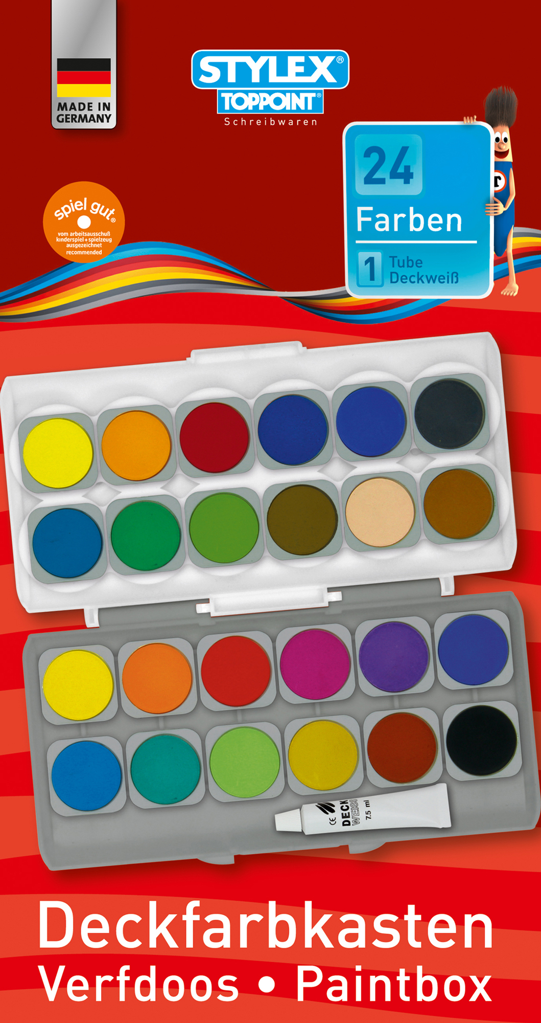 Stylex 24er Schuldeckfarbkasten mit 1 Tube Deckweiß und 6 Mischfeldern 24er Schuldeckfarbkasten mit einer Tube Deckweiß ohne Pinsel. Der Deckel ist zum Abnehmen und bietet ein leichtes Öffnen und Schließen. Es gibt 6 integrierte runde Mischfelder mit auswechse...