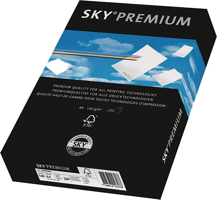 Premium Kopierpapier Das PREMIUM Papier von SKY bietet höchste Qualität für hohe Ansprüche; und das für alle Drucktechnologien. Hochweiss Mit dem zukunftsweisenden FSC-Zertifikat für nachhaltige Waldwirtschaft Geeignet für alle Trockentoner-Kopierer, Laser un...
