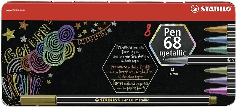 Der STABILO Pen 68 metallic verleiht kreativen Ideen einen einzigartigen Metallic-Look. Besonders auf schwarzem Papier, Karton und vielen weiteren Oberflächen, wie z.B. Schiefer, Glas, Metall und Folie, sorgen die Metallic-Farben durch die hohe Deckkraft des F...
