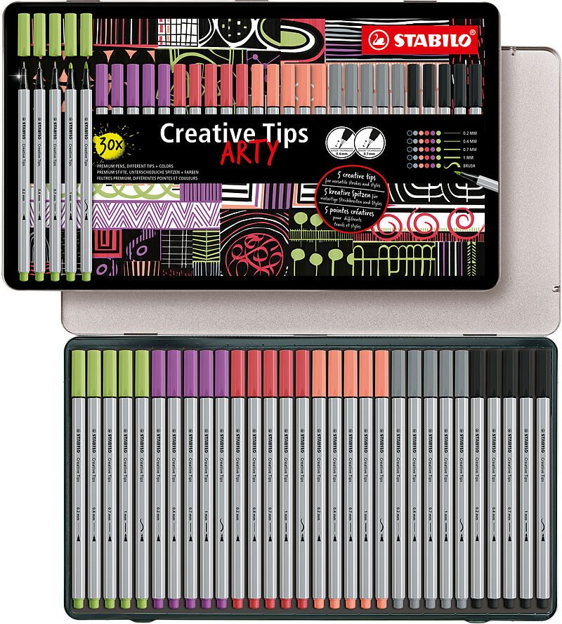 ARTY - Creative Set's STABILO® Creative Tips 30er Metalletui ARTY PASTEL Hochwertiges Metalletui Tinte auf Wasserbasis, geruchsneutral Von präzisen Linien bis hin zu kräftigen Pinselstrichen Fünf Spitzen: 0,2 mm (Fineliner), 0,4 mm (Fineliner, gefedert),...