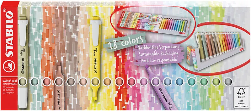 STABILO swing cool Leuchtmarkierer NatureCOLORS. 18er Tischset assortiert Praktisches Tischset aus stabilem Karton mit grosser Farbvielfalt. Das Set enthält 18 einzelne Textmarker. Mit den swing cool NatureCOLORS in 6 trendigen, von der Natur inspirierten Far...