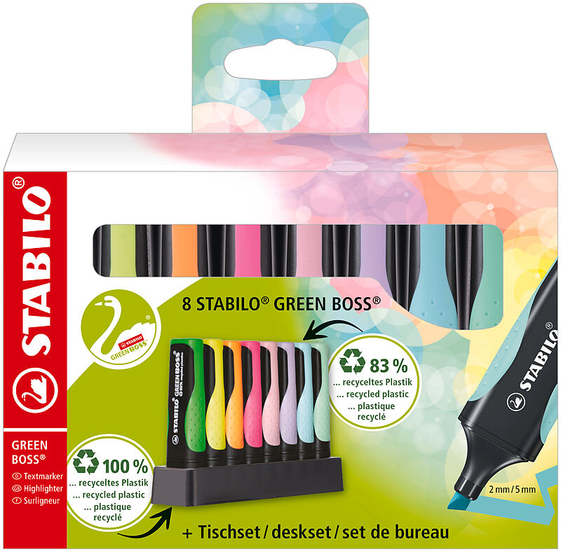 Der STABILO GREEN BOSS ist ein Textmarker aus 83 % recyceltem Kunststoff für Schüler, Studenten, Lehrer und Büroangestellte mit Umweltbewusstsein. Den nachhaltigen Textmarker gibt es in angesagten Pastell- und Leuchtfarben! Der Pastellmarker zeichnet sich durc...