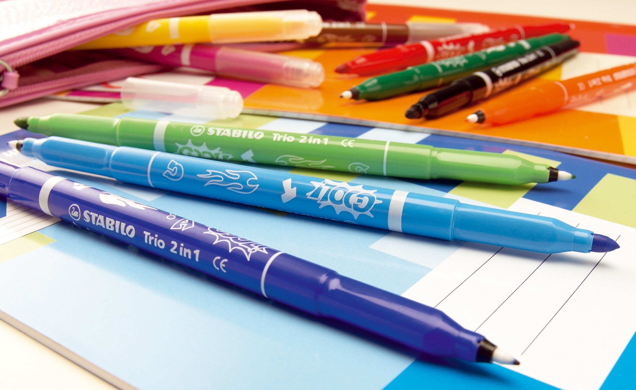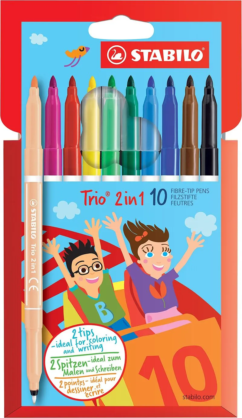 TRIO 2 IN 1 - Fasermaler Möchtest du mit einem Filzstift flächendeckend malen oder doch lieber in kräftigen Farben schreiben? Mit dem STABILO Trio 2 in 1 musst du dich nicht länger zwischen den beiden Techniken entscheiden. Der beliebte Filzstift kommt mit zw...