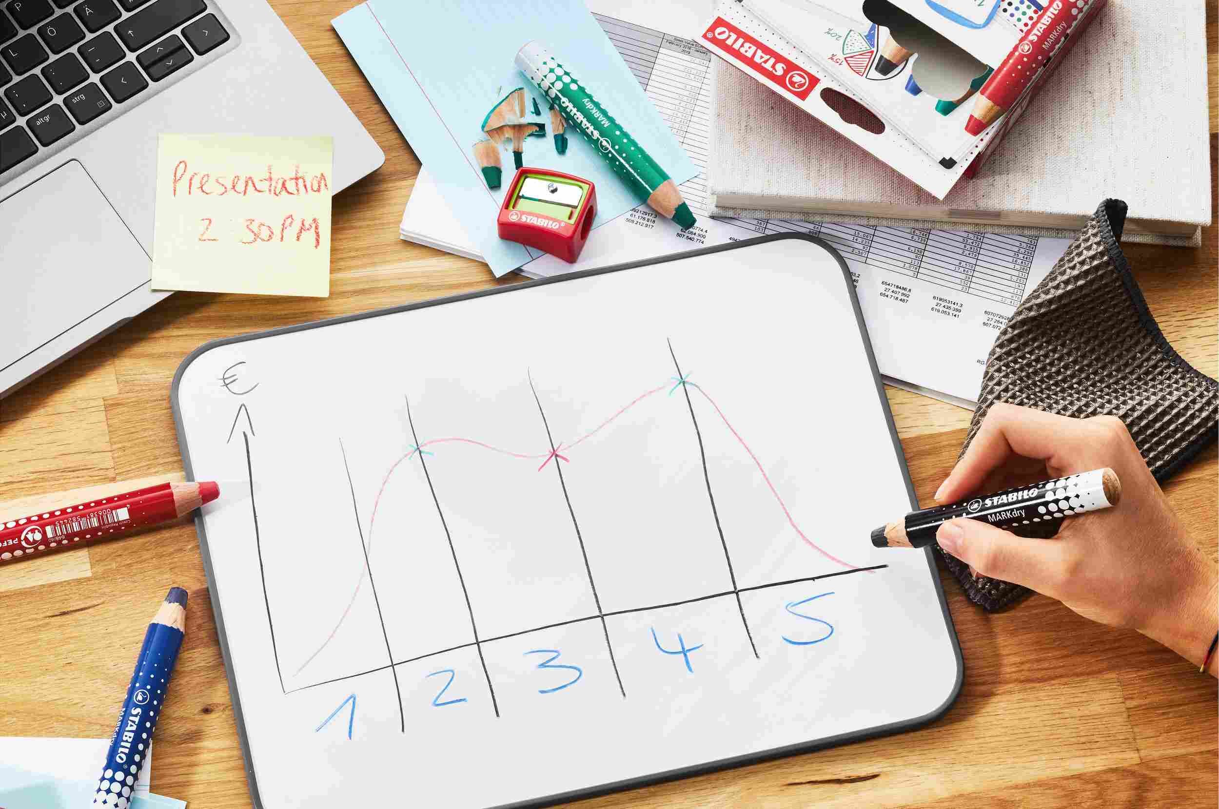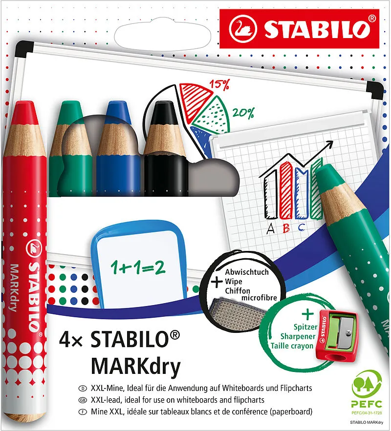 MARKdry Whiteboardmarker 4er Etui Der STABILO® MARKdry vereint die Vorteile von holzgefassten Stiften und ist perfekt für den Einsatz auf Whiteboards und Flipcharts in Schule und Büro. 100% PEFC-zertifiziertem Holz hergestellt Stärke der Mine: 10 mm Lässt sic...