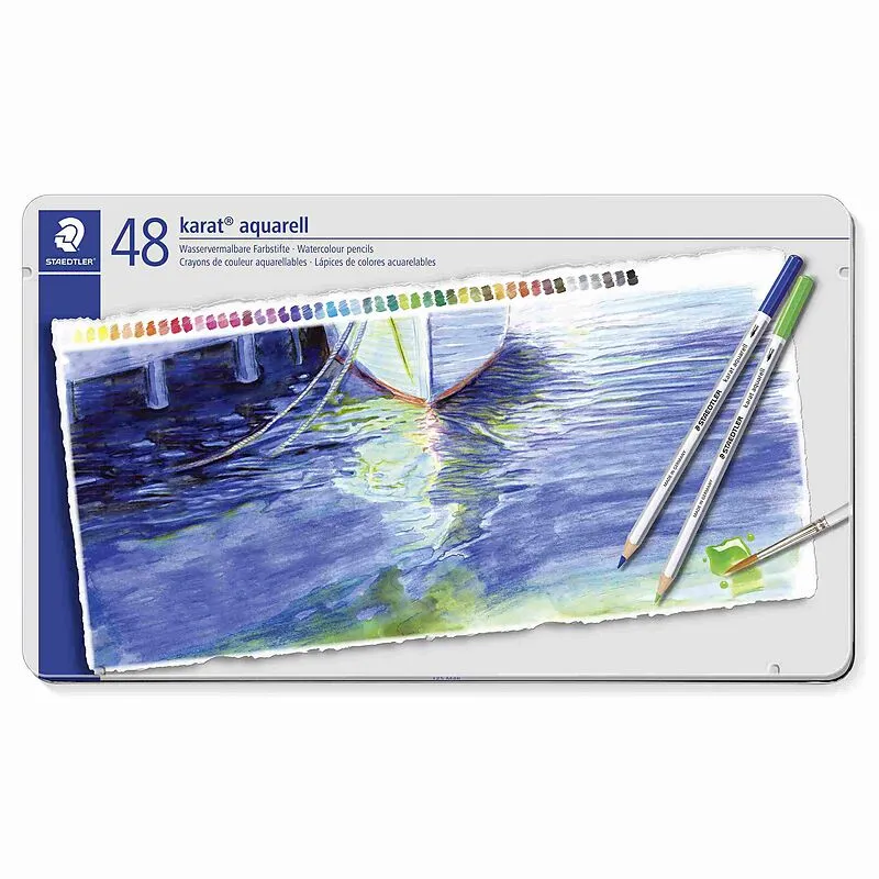 Metalletui mit 48 Aquarellstiften in sortierten Farben. - Hochwertiger Farbstift im klassischen Sechskantformat mit wasservermalbarer Mine - Besonders weiche und farbintensive Mine für zarte bis verblüffend leuchtende Effekte mit Wasser und Pinsel auf Aquarell...
