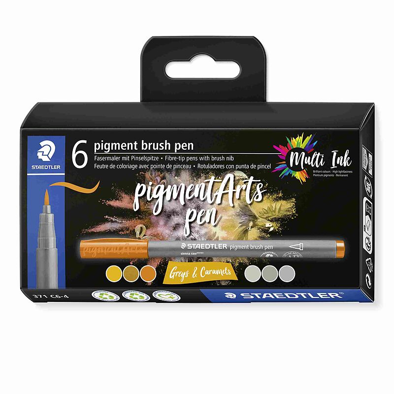 PIGMENT ARTS - Etuis Die Innovation für eine farbenfrohe und nachhaltige Zukunt STAEDTLERs neues Brush-Sortment pigment arts mit der einzigartigen Multi Ink Tinte vereint die Vorteile farbstoffbasierter Tinten mit Pigmenttinten: Leuchtende Farbbrillanz mit ei...