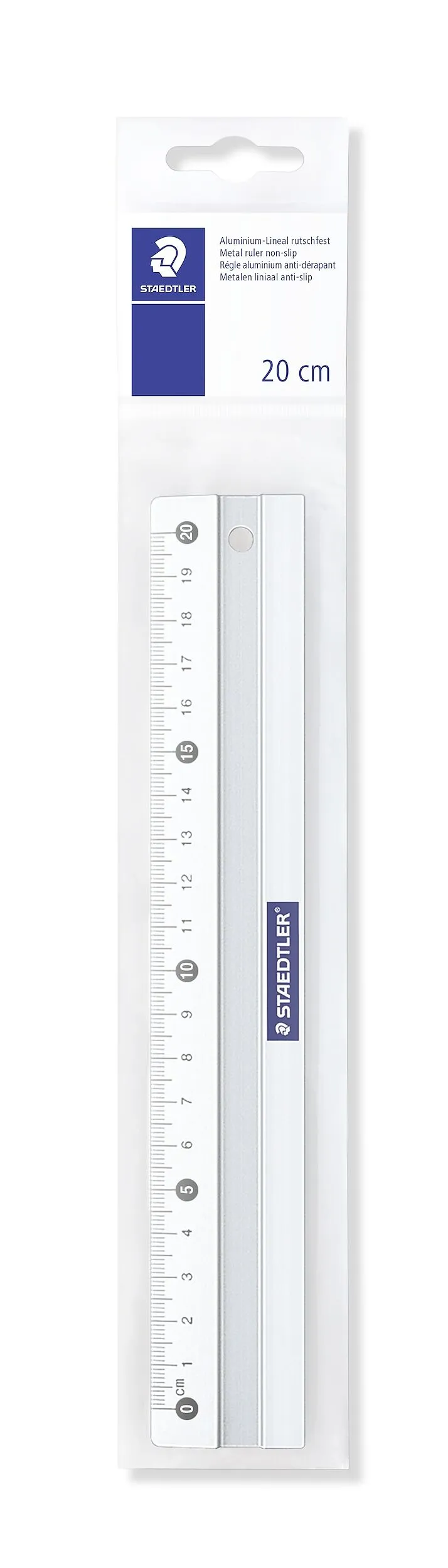 Mars Aluminium-Lineal. Werkstoff: Aluminium. Ausführung der Tuschekante: unterseitig. Geprägte Teilung, integrierter, rutschhemmender Streifen an der Unterkante. Länge: 20 cm. Farbe: silber.