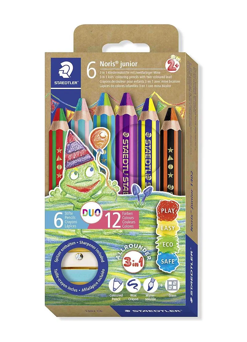 Noris® junior 140 3 in 1 Kindermalstift DUO • Zusätzlich zu den Standardfarben und den vier Neonbuntstiften präsentieren wir nun 6 weitere zweifarbige Noris® junior DUO Buntstifte • Die 6 Farbkombinationen aus 12 verschiedenen Farb...