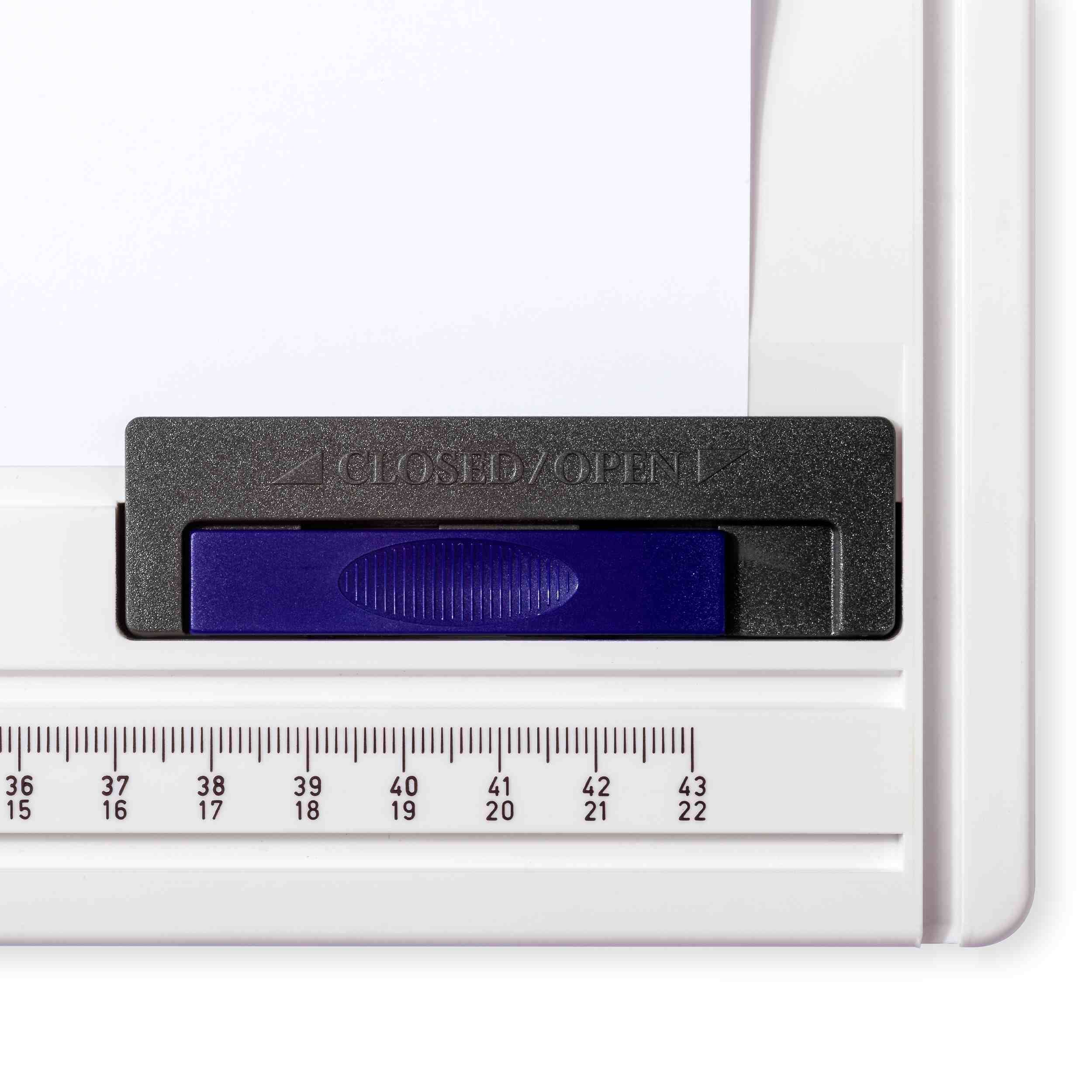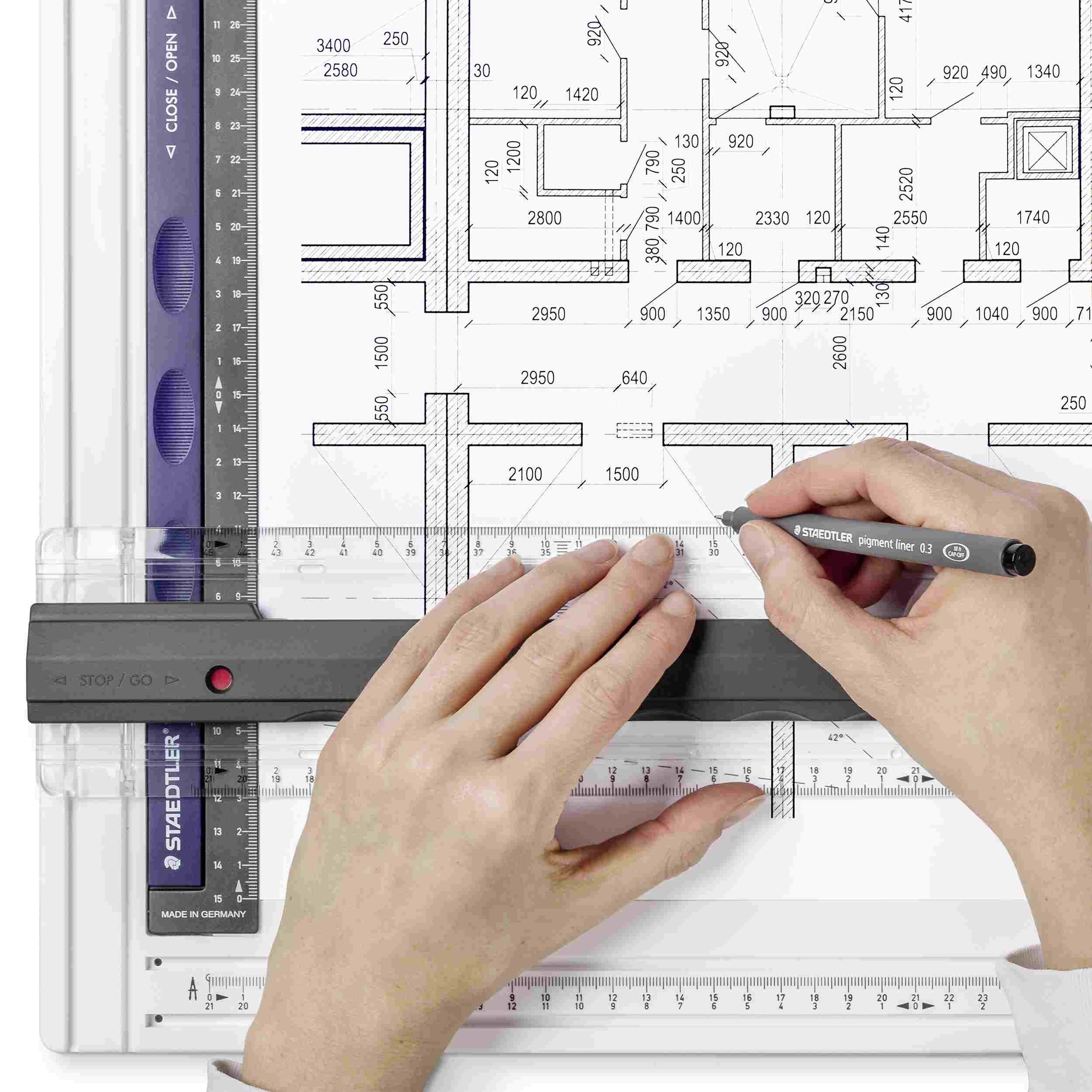 - Mit Parallel-Zeichenschiene mit beidseitiger Skalierung - Komfortable Einhand-Doppelarretierung an jeder beliebigen Stelle der Griffleiste - Doppelnutführung für besonders sanftes, ruckfreies Gleiten des Lineals - Arretierungs- und Freilaufanzeige durch Sign...