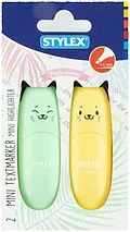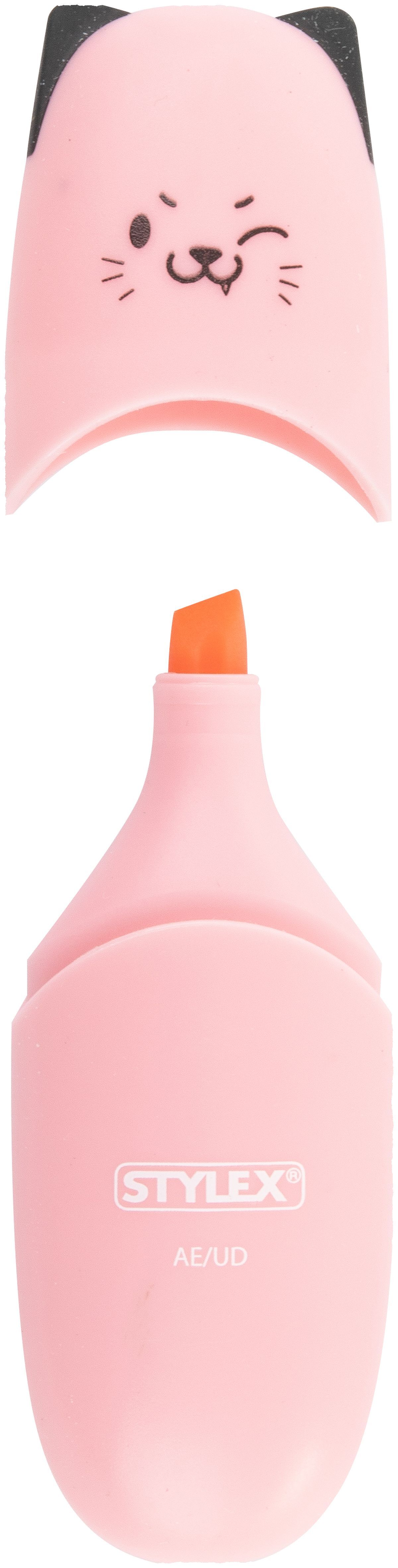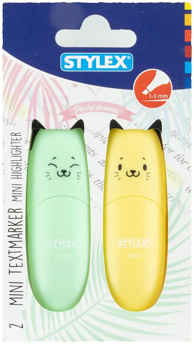 2 Mini-Textmarker im Katzendesign, Kappe mit Katzengesicht bedruckt, Strichstärke 1-4 mm, praktische Keilspitze ist ideal zum feinen Unterstreichen oder Markieren von Texten, brilliante Farbintensität, farbig sortiert, in Kartonschachtel